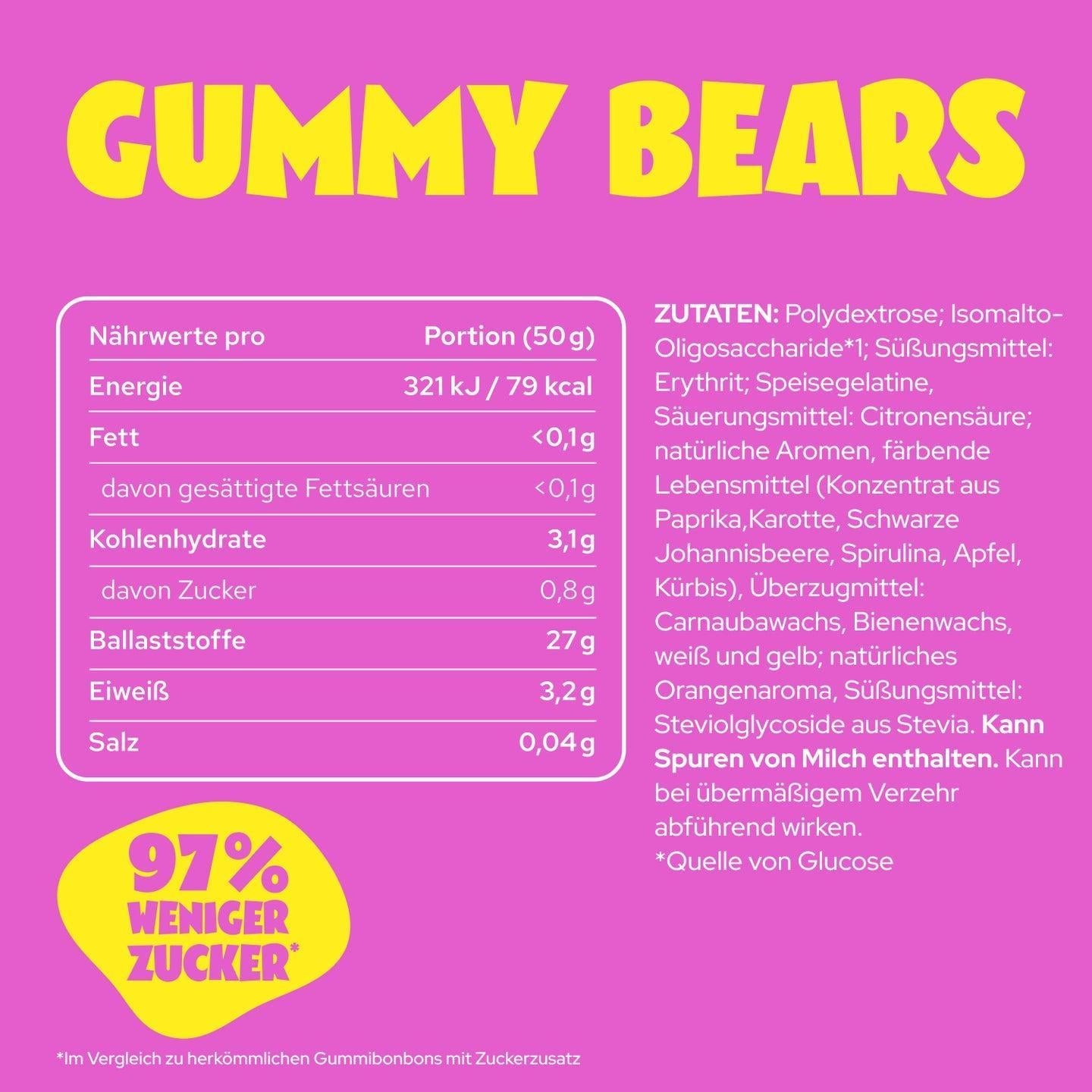 Ja. Sie kommen ohne Zuckerzusatz aus und enthalten rund 97% weniger Zucker als herkömmliche Fruchtgummis – pro 50 g liegt der Zuckergehalt unter 1 g (sortenabhängig).
