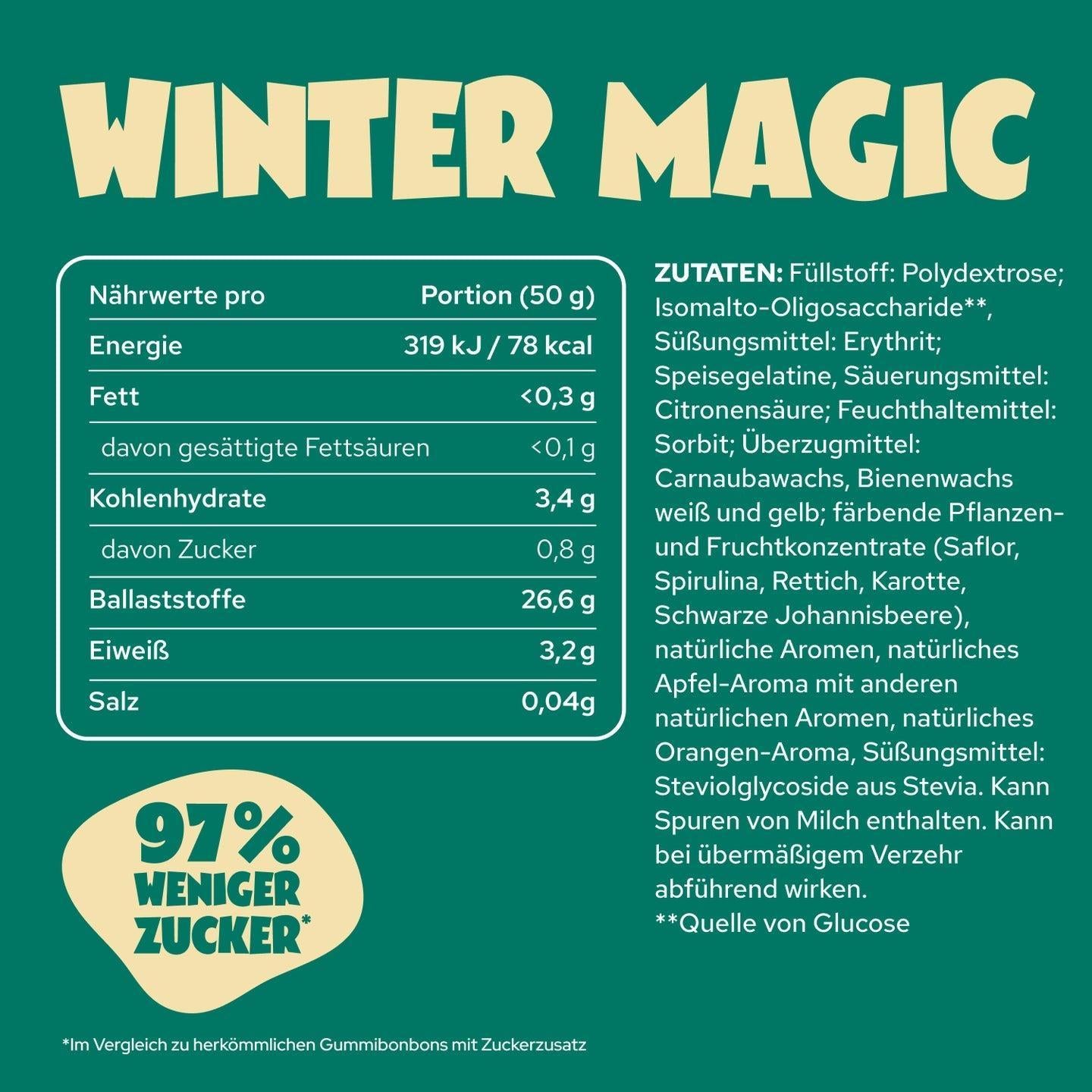 Unter anderem Green Apples, Sour Cola, Sweet Peaches, Sour Cherries, Fluffy Hearts, Winter Friends, Winter Magic und Gummy Bears.