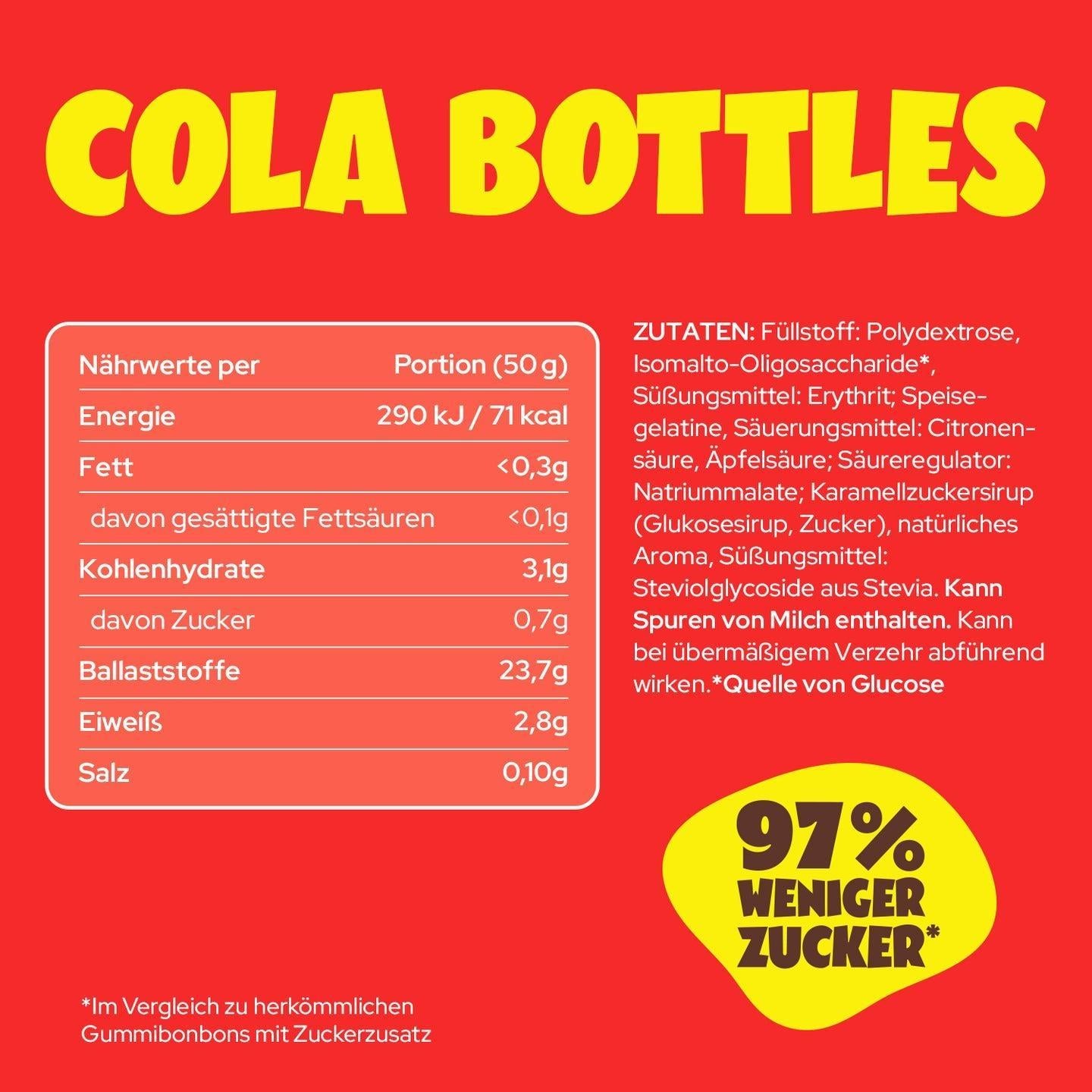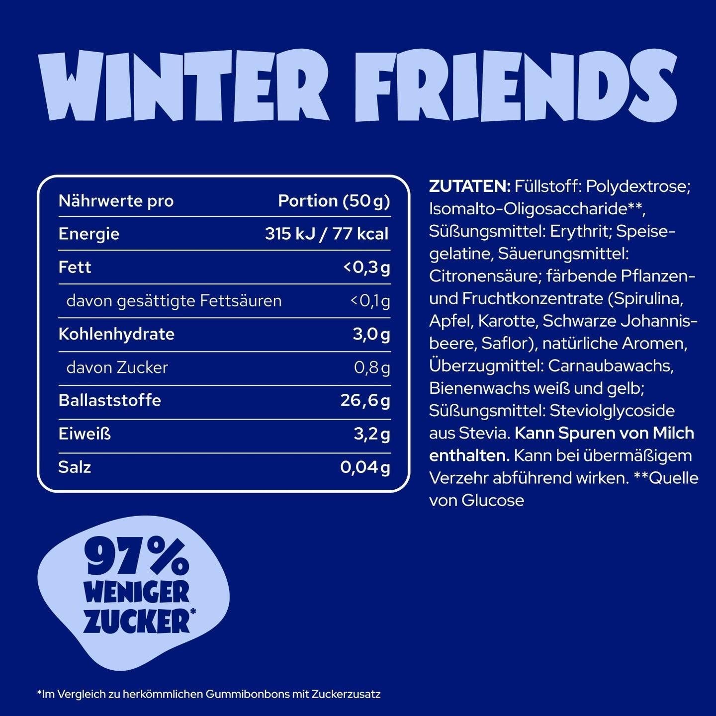 Füllstoff: Polydextrose, Isomalto-Oligosaccharide (Quelle von Glucose), Süssungsmittel: Erythrit, Speisegelatine, Säuerungsmittel: Zitronensäure, Äpfelsäure, Säureregulator: Natriummalate, natürliches Aroma, färbende Lebensmittel (Konzentrate aus Saflor, Spirulina), Süssungsmittel: Steviolglykoside aus Stevia.