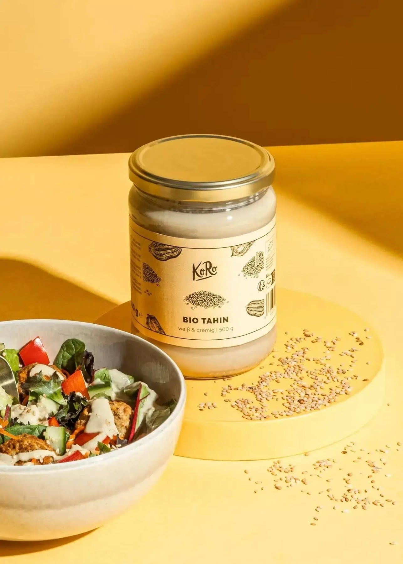 On cool days, try an easy creamy tahini roasted vegetable bake: mix 2–3 tbsp tahini with a little lukewarm water, lemon juice, a pinch of salt, pepper and some garlic into a thick, smooth sauce. Cut seasonal vegetables like carrots, parsnips, pumpkin, potatoes or broccoli into pieces, toss with a little olive oil and roast in the oven until soft and nicely browned at the edges. Right after baking, arrange the hot vegetables on a platter and drizzle generously with the tahini sauce. If you like, finish with fresh parsley, toasted seeds or a bit of lemon zest. This way you make the most of the creamy texture and pleasantly nutty taste of your tahini – with very little effort but lots of warmth and flavour on the plate.