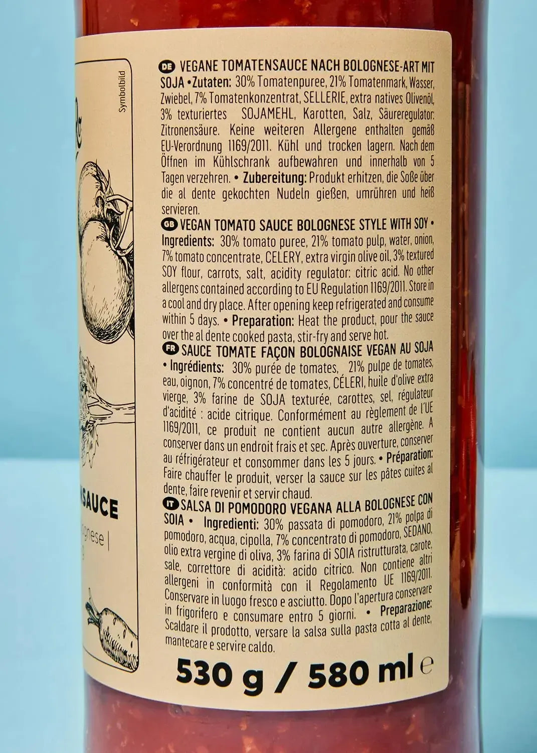 Legal designation: Vegan tomato sauce Bolognese-style with soy. Origin: Italy. Processing: Italy. Net weight: 530 g. Storage: Store in a cool, dry place. Once opened, keep refrigerated and consume within 5 days. Contains soy and celery. Without red or white wine. Manufacturer: KoRo Handels GmbH, Hauptstrasse 26, 10827 Berlin, Germany.