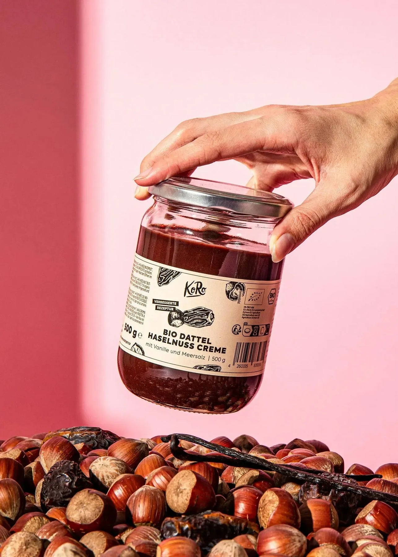 The improved recipe focuses on what really matters: delicate hazelnut notes, harmoniously balanced with vanilla and a hint of sea salt. The result is a rounded, full-bodied flavor without unnecessary additives – vegan, palm-oil free and 100% organic.