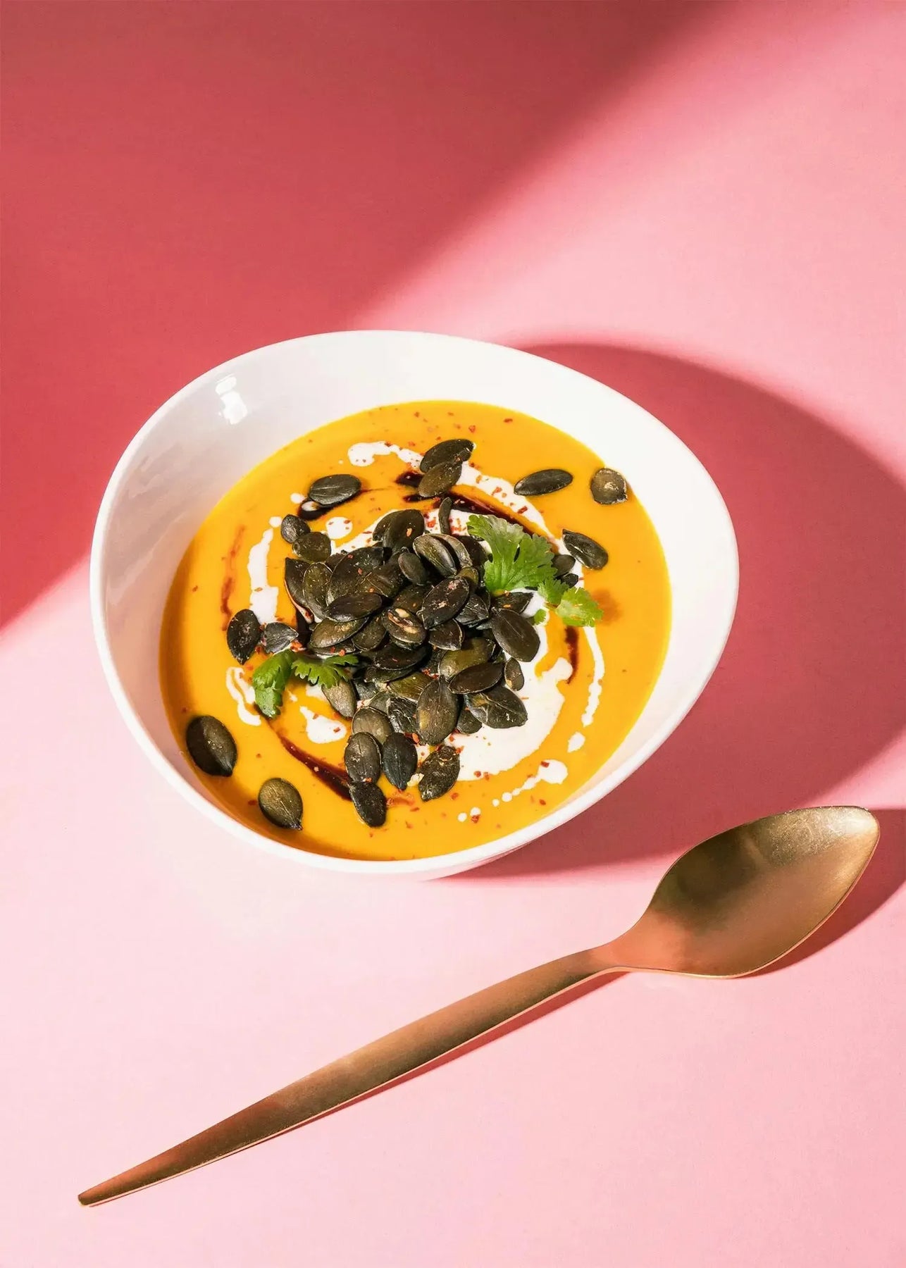 Utilise les graines de courge grillées et salées comme topping croustillant pour une plaque de légumes rôtis automne-hiver: coupe par exemple de la courge, des carottes, des pommes de terre et des oignons rouges en morceaux, mélange-les avec un peu d’huile d’olive, du sel, du poivre et des herbes fraîches, puis fais rôtir au four jusqu’à ce que les légumes soient tendres et légèrement dorés. Juste avant de servir, parsème généreusement les graines de courge par-dessus – elles restent ainsi bien croquantes et apportent une note savoureuse et légèrement noisettée. Astuce en plus: une cuillerée de yogourt nature ou une petite sauce à l’ail accompagne parfaitement ce plat réconfortant après une journée froide.