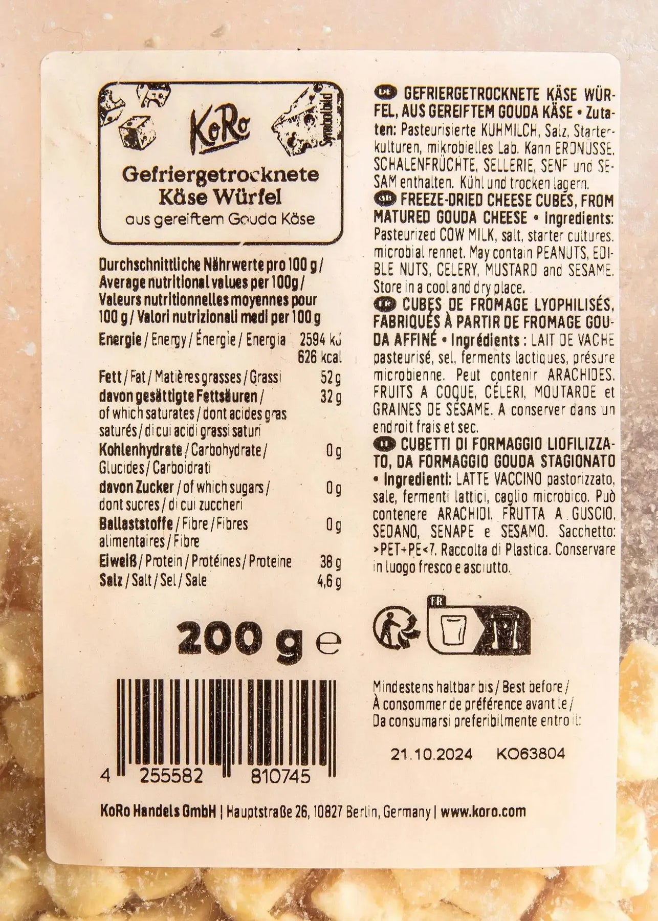 Dénomination légale: Cubes de fromage lyophilisé à base de Gouda affiné. Conserver au frais et au sec. Non ouvert, se conserve jusqu’à 15 mois dans des conditions optimales. À consommer de préférence avant: voir impression. Après ouverture, bien refermer et protéger de l’humidité. Origine: fromage des Pays-Bas; Transformation: Allemagne. Peut contenir du gluten, des arachides, du soja, du lait (lactose), des fruits à coque, du céleri, de la moutarde et du sésame.