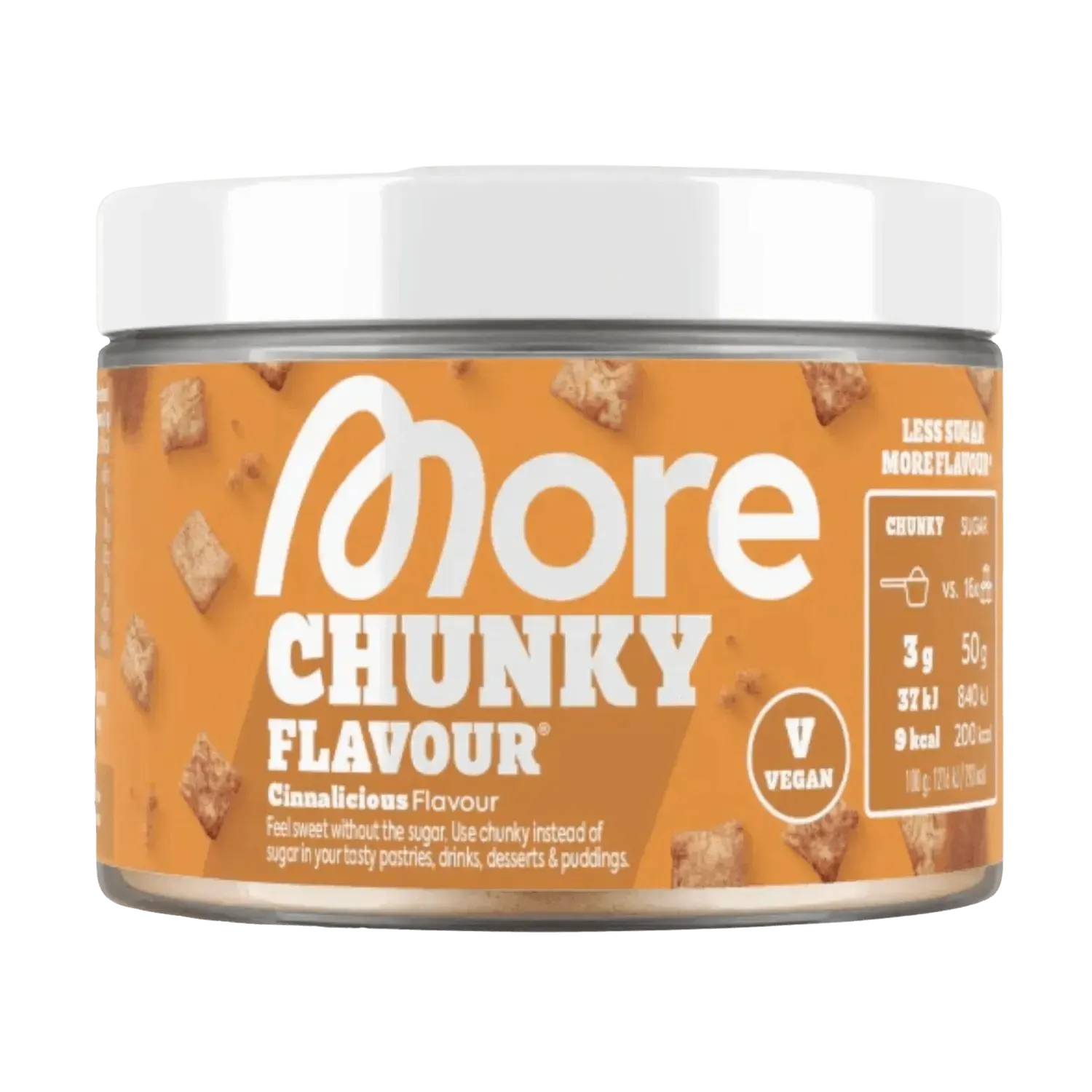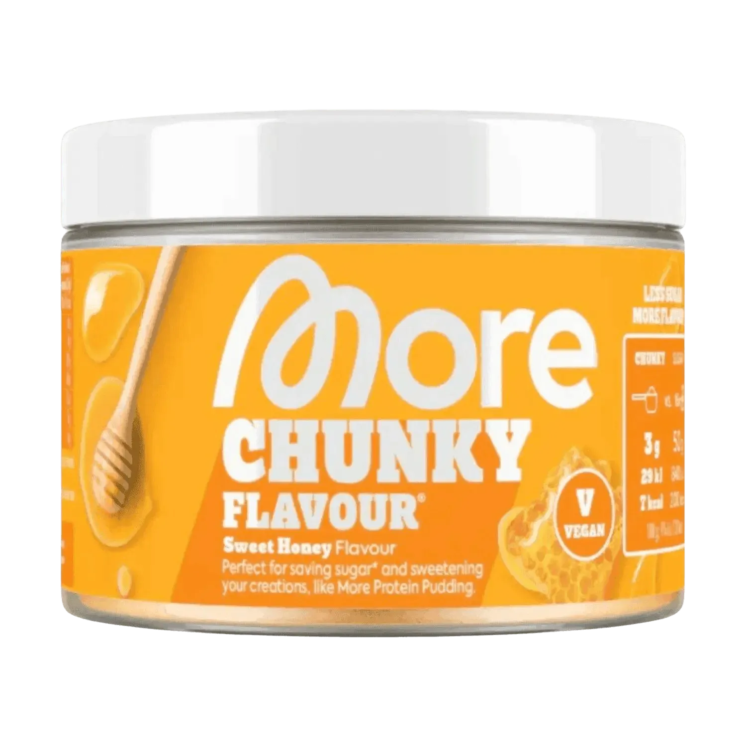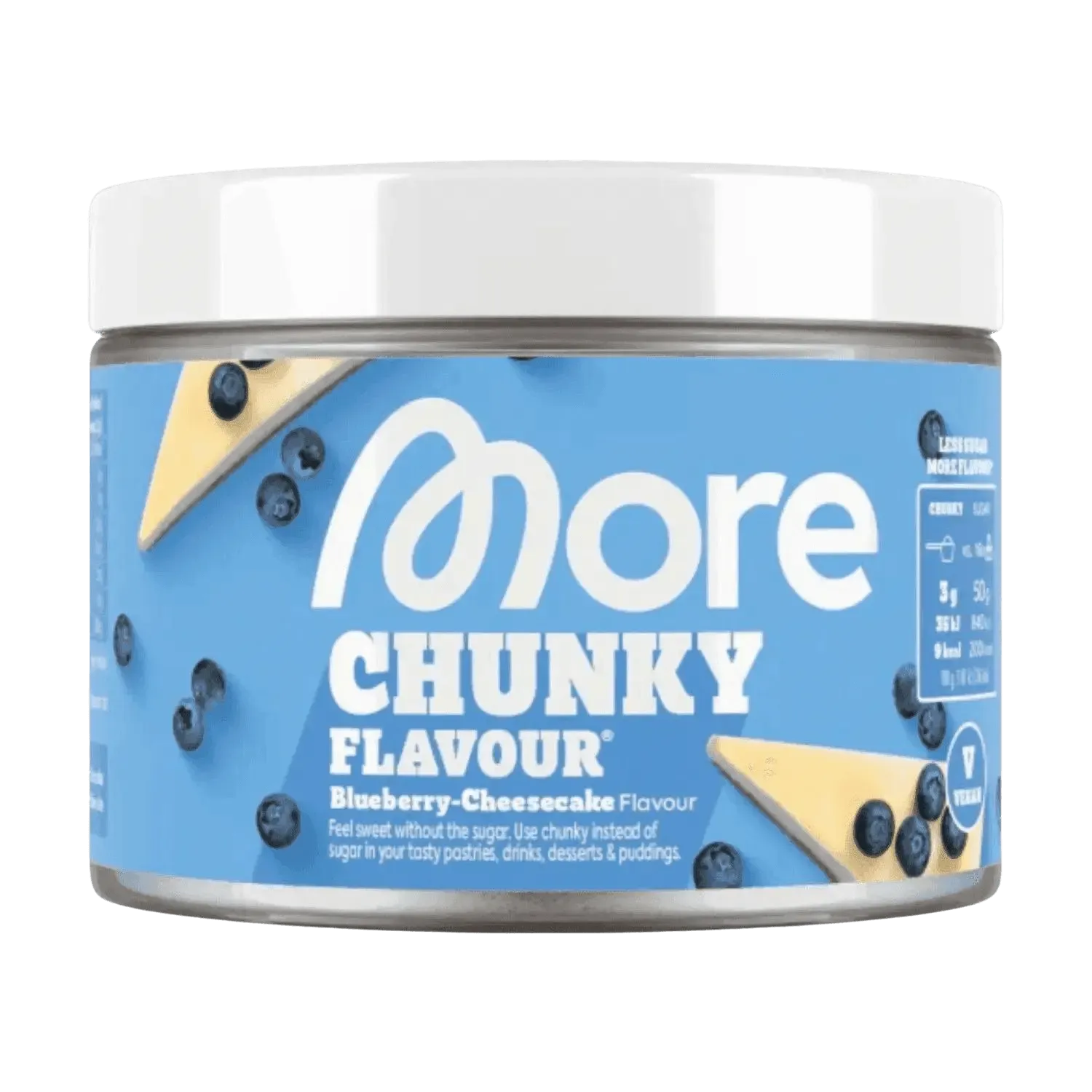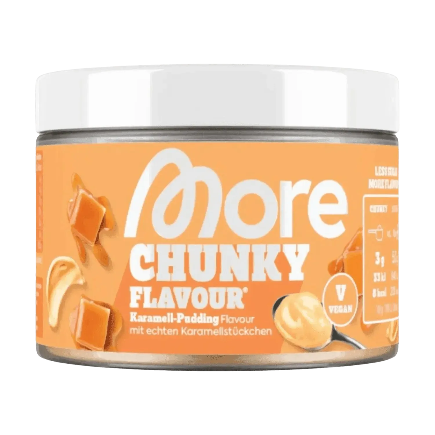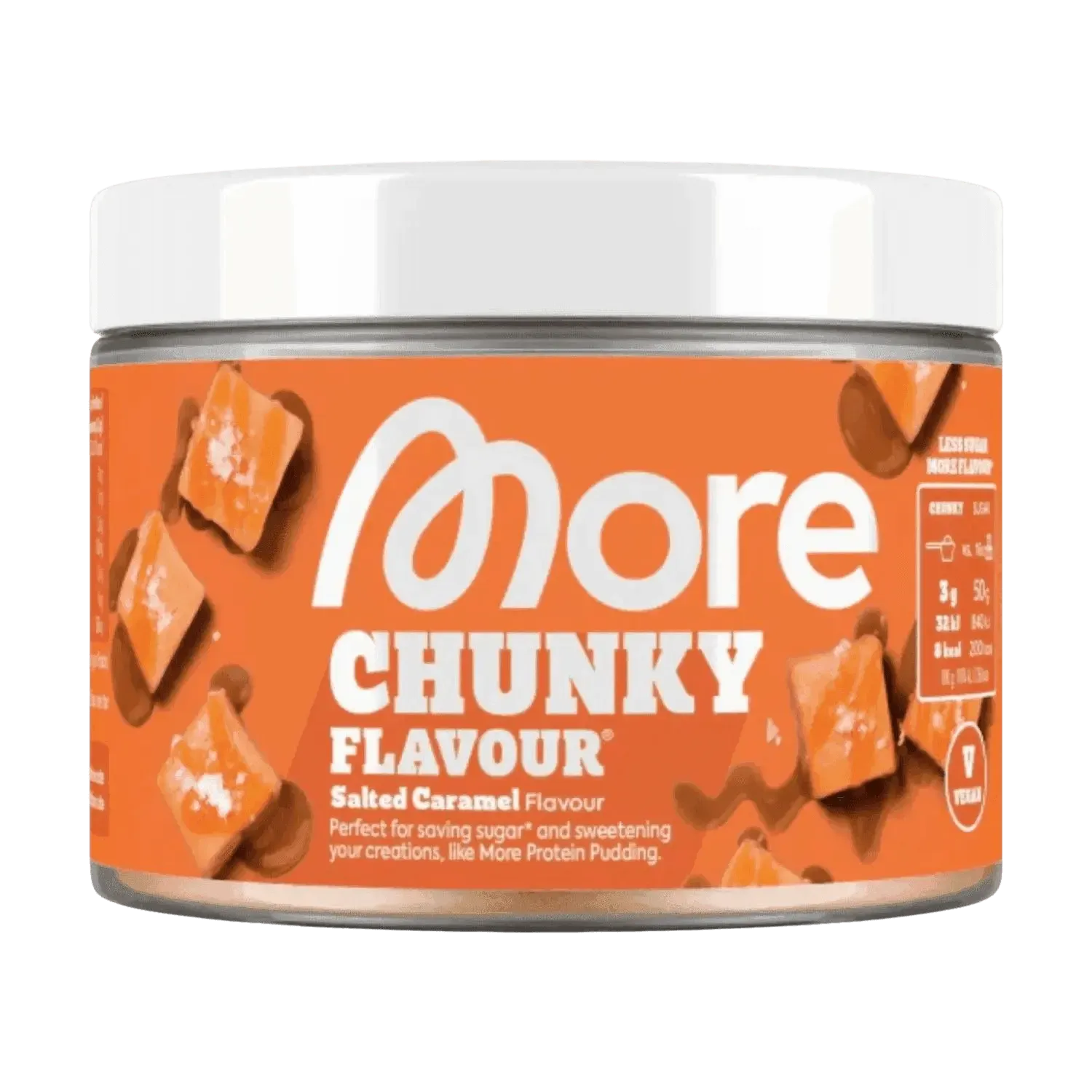 Goût sucré, peu de calories : More Nutrition Chunky Flavour sublime yaourt, porridge, café & cie — 3 g offrent la douceur d’environ 50 g de sucre pour seulement 6–12 kcal.