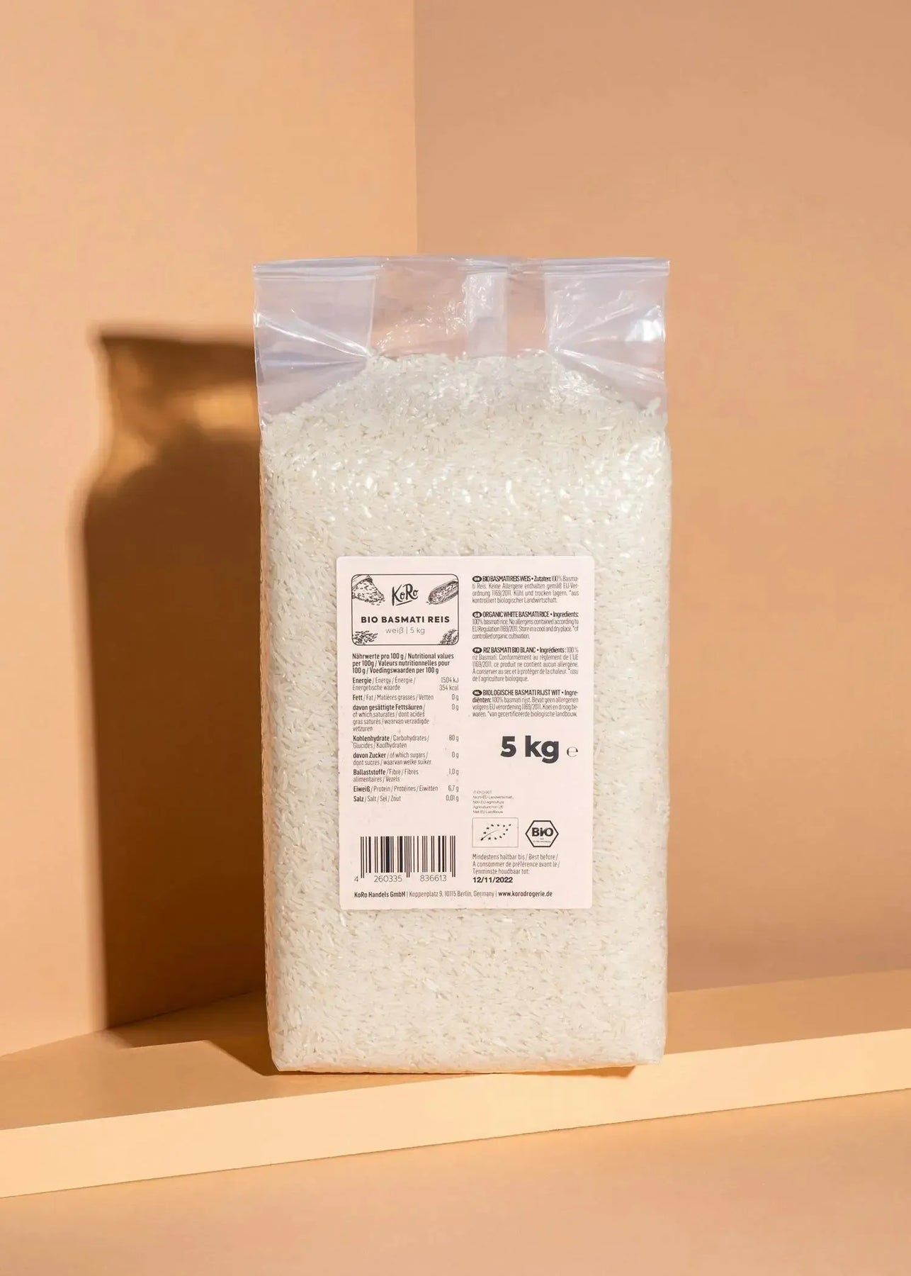 Dénomination légale: Riz basmati blanc bio. Origine: Pakistan. Organisme de contrôle bio UE: IT-BIO-007. Agriculture biologique: hors UE. Stockage: Conserver au frais et au sec, à l’abri de la chaleur. À consommer de préférence avant: voir l’impression sur l’emballage. Peut contenir des traces de gluten.